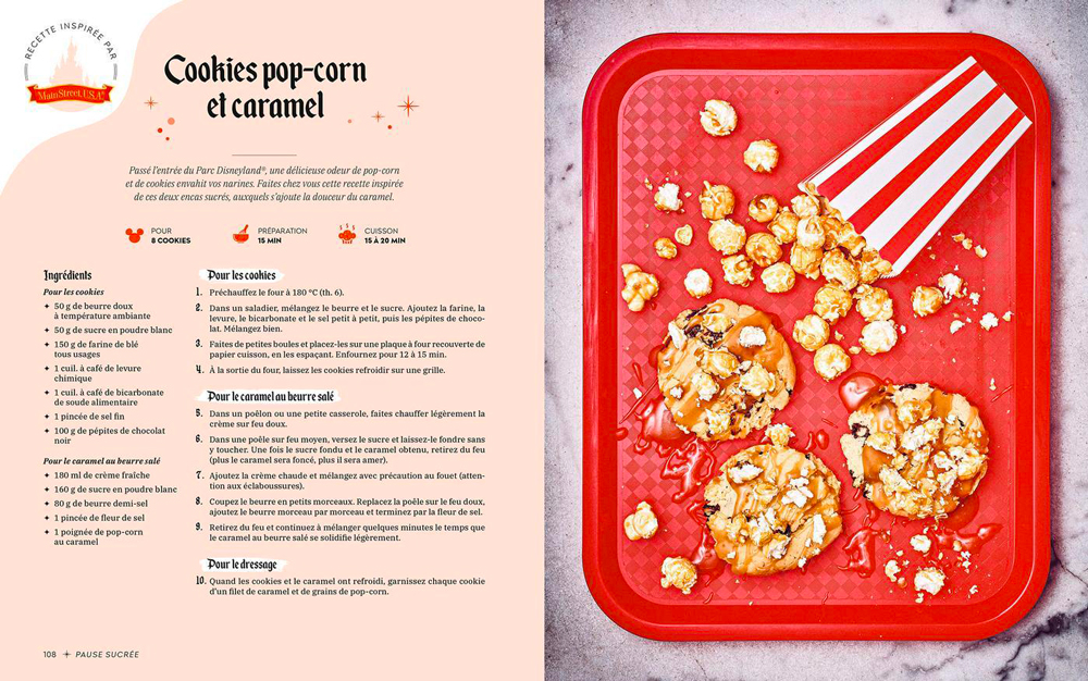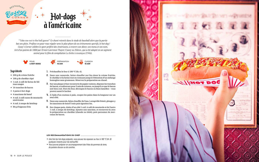 On y retrouve les incontournables : le mythique Mac & Cheese du restaurant Walt’s, le tajine de veau aux abricots de l’Agrabah Café, les asperges à la sauce champagne de l’Auberge de Cendrillon, les gaufres Mickey au pesto rouge, courgette et mozzarella inspirées par Main Street U.S.A, le bagel pastrami inspiré du Disneyland Railroad, la tarte aux noix de pécan du restaurant Plaza Gardens, ou encore la baklava à la pistache, fleur d’oranger et miel du restaurant Le passage enchanté d’Aladdin.