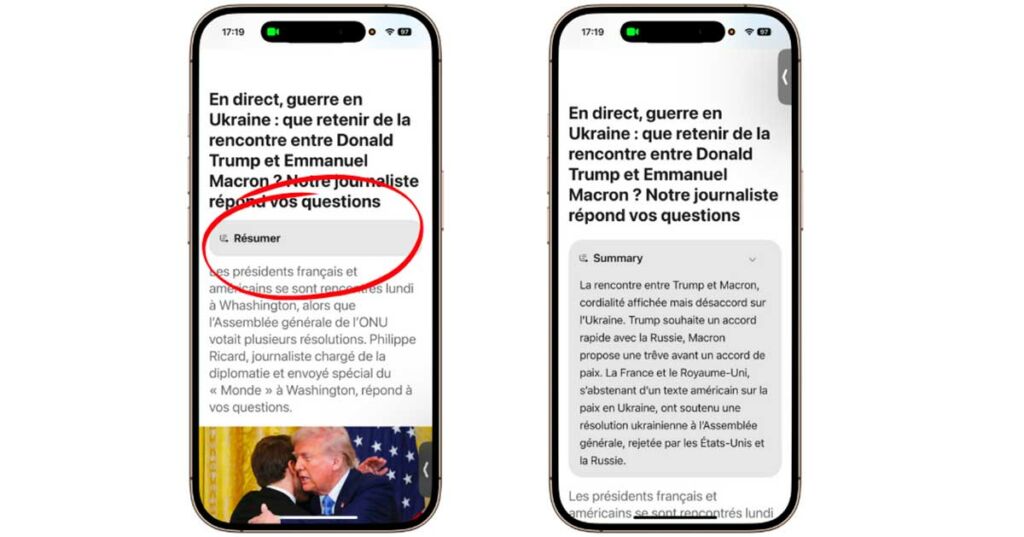 Apple Intelligence s’insère un peu partout dans l’iPhone. Dans Messages et Mail, les résumés intelligents permettent de condenser les conversations longues en quelques lignes. Pratique pour éviter de scroller indéfiniment, même si l’algorithme manque encore de finesse en français. Parfois, c’est un peu comme une série de mots-clés mis les uns à côté des autres. Safari bénéficie aussi d’un outil de résumé d’articles web : en un clic, l’IA extrait les points clés d’un texte trop long. L’idée est excellente, mais, là encore, la qualité des résumés est inégale.