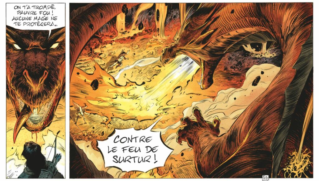 Pour David Etien, le scénario imaginé par Olivier Legrand et Jean-Blaise Djian s’est révélé excitant, car il est particulièrement spectaculaire et organique. La nature sous toutes ses formes y est omniprésente. Tout commence par une tempête en pleine mer, avec des vagues énormes. Ensuite, le lecteur se retrouve dans un environnement glacial, avec du vent et de la neige, pour finir en plein milieu d’un volcan en éruption avec de la lave en fusion. Le tout saupoudré… de dragons.
