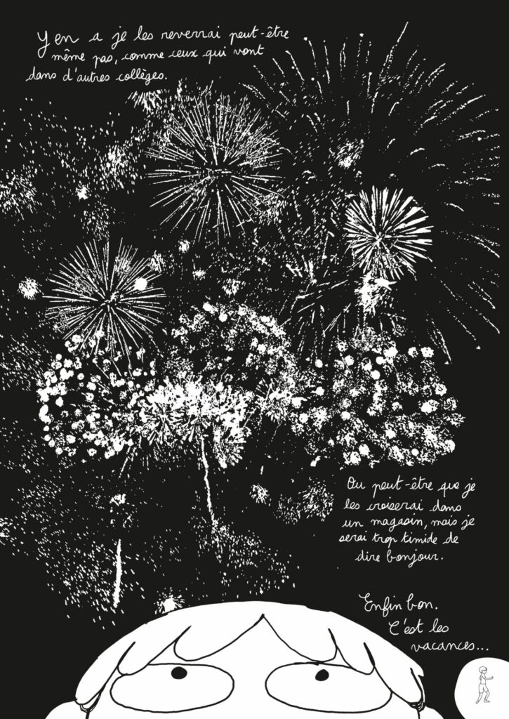 C’était un vrai défi de retravailler les moments de musique, que j’ai remplacés par des dessins silencieux, représentés par des doubles pages. J’ai également dû compléter le journal de Samuel, en réécrivant certaines phrases afin de mieux comprendre ce qui se passe. Je redécouvrais ma série d’une autre façon, je redécouvrais même ce qui se passait dans la tête de Samuel. Certaines situations me paraissent d’un coup beaucoup plus évidentes. Par exemple, il y a un moment où il gribouille sur son journal tellement il est énervé et bouleversé. Je voulais qu’on le ressente dans l’écriture. Je me suis mise dans la peau de Samuel et j’ai commencé à raturer le journal.