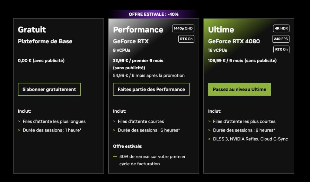 GeForce NOW dispose d’une offre gratuite avec publicité et pour des sessions de jeu très limitées. Le service propose deux formules payantes, permettant de prétendre à des performances plus ou moins importantes, à partir de 10,99 € par mois. En ce moment, une offre estivale permet de s’abonner à GeForce NOW pour six mois pour 32,99 €. Des passes journaliers (4,39 €) sont également disponibles en dépannage.