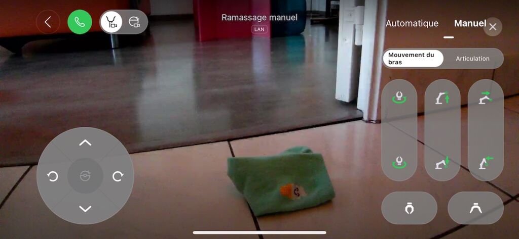 Vous n’êtes pas tellement rassuré à l’idée qu’il déplace des objets dans votre maison en toute autonomie ? C’est compréhensible et Roborock l’a prévu. Dans l’onglet de l’application dédié au paramétrage du bras, plusieurs possibilités s’offrent à vous : soit effectivement le laisser bouger les objets ou les trier automatiquement, soit garder le contrôle en choisissant le tri manuel. Dans ce cas, parmi les choses que le robot a signalé pouvoir saisir, c’est à vous d’indiquer une par une lesquelles il doit ramasser. Il laissera les autres où elles sont. Enfin, il est possible de piloter le Saros Z70 à distance à l’aide d’un pavé de navigation numérique composé de flèches. On le dirige vers l’objet qu’on veut ramasser et, arrivé devant, on a là encore deux possibilités : cibler l’objet et laisser le bras agir automatiquement ou bien guider le bras, en pilotant son orientation vers le haut, vers le bas, l’avant, l’arrière, faire pivoter la pince, l’ouvrir, la fermer…
