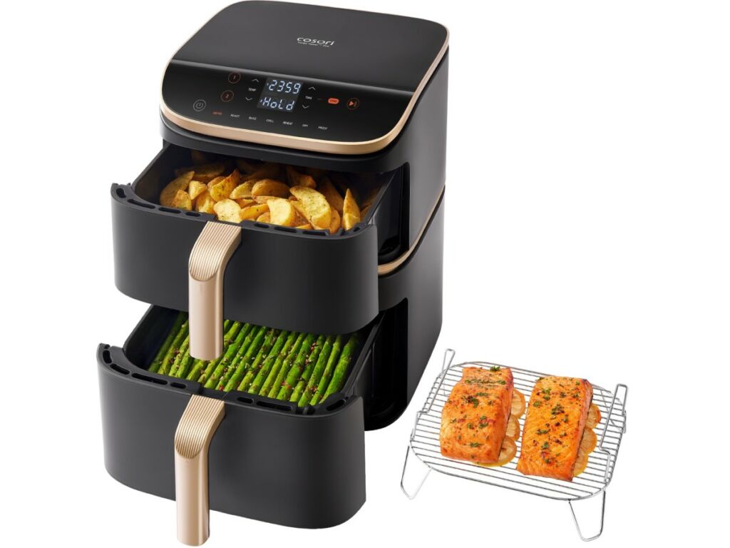 L’évolution la plus évidente concerne sans aucun doute la capacité et le format de ces appareils : qu’on recherche un modèle compact qui puisse tenir dans une kitchenette ou un airfryer familial pour préparer des plats destinés à une grande tablée, on peut facilement se procurer l’un ou l’autre – de 4 L à plus de 11 L, il y a le choix. Et si on souhaite une contenance confortable, mais qu’on a malgré tout une petite cuisine, la parade, c’est l’airfryer vertical. Ces appareils arborent deux tiroirs superposés, qui permettent ainsi de préparer deux types d’aliments en même temps, par exemple une viande ou un poisson et des légumes, mais sans occuper trop d’espace sur le plan de travail.