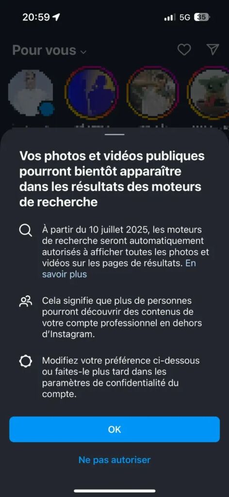 Avant le 10 juillet 2025, rendez-vous dans Paramètres > Confidentialité du compte et décochez l’option baptisée « Autoriser les photos et vidéos publiques à apparaître dans les résultats de moteurs de recherche ». Si cette option n’apparaît pas (c’est le cas de l’auteur de ces lignes), il est probable que ce soit simplement en raison du déploiement progressif de l’alerte auprès des internautes. La notification et l’option associée devraient être proposées à toutes et tous à l’approche de l’échéance, le mois prochain.