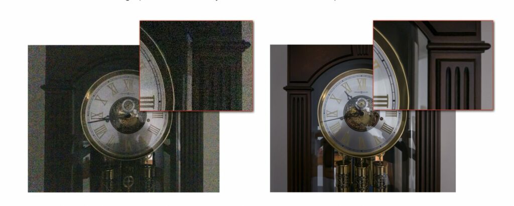 Misant à plein sur la photographie computationnelle (c’est-à-dire les photos dont le rendu dépend en grande partie de la puissance de calcul de l’appareil et de ses algorithmes de traitement), Indigo capture simultanément 32 clichés à très haute vélocité lorsque vous pressez l’obturateur. Celles-ci sont ensuite combinées afin d’améliorer l’exposition (déboucher les noirs, améliorer la lisibilité des hautes lumières), réduire le bruit numérique et renforcer la netteté – a fortiori sur les longues focales, moins bien définies que le capteur principal, orné d’un objectif grand-angle.