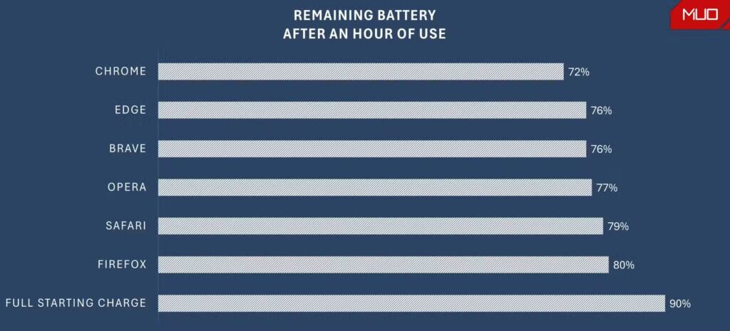 Dans un souci de reproductibilité de son test, le journaliste Amir M. Bohlooli a mis en place un protocole très simple : de la lecture de vidéo sur YouTube, avec une liste de lecture standardisée permettant de s’assurer que le test dure autant de temps sur chaque navigateur. En l’occurrence, voici les applications qui ont été retenues pour ce test : Google Chrome, Microsoft Edge, Brave, Opera, Safari et Firefox. Chaque test durait une heure, et l’idée est de constater combien de pourcentage de batterie le test a grignoté sur ce laps de temps. Voici le résultats.