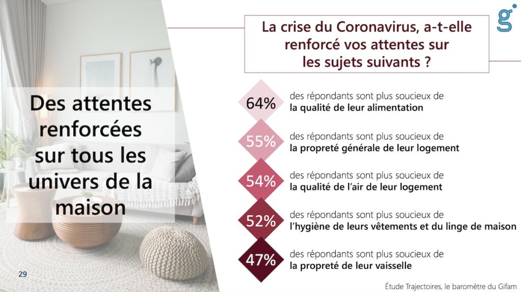 On sait que le Covid a eu des impacts sur les habitudes en matière d’hygiène, un domaine dans lequel les Français sont devenus plus méticuleux et plus exigeants. En 2021, après la pandémie, dans l’étude Trajectoires du Gifam, ils étaient 15 % à déclarer faire plus le ménage et un sur cinq à affirmer entretenir les sols plus fréquemment. En 2024, encore, ils disent consacrer plus de deux heures par semaine aux tâches ménagères.