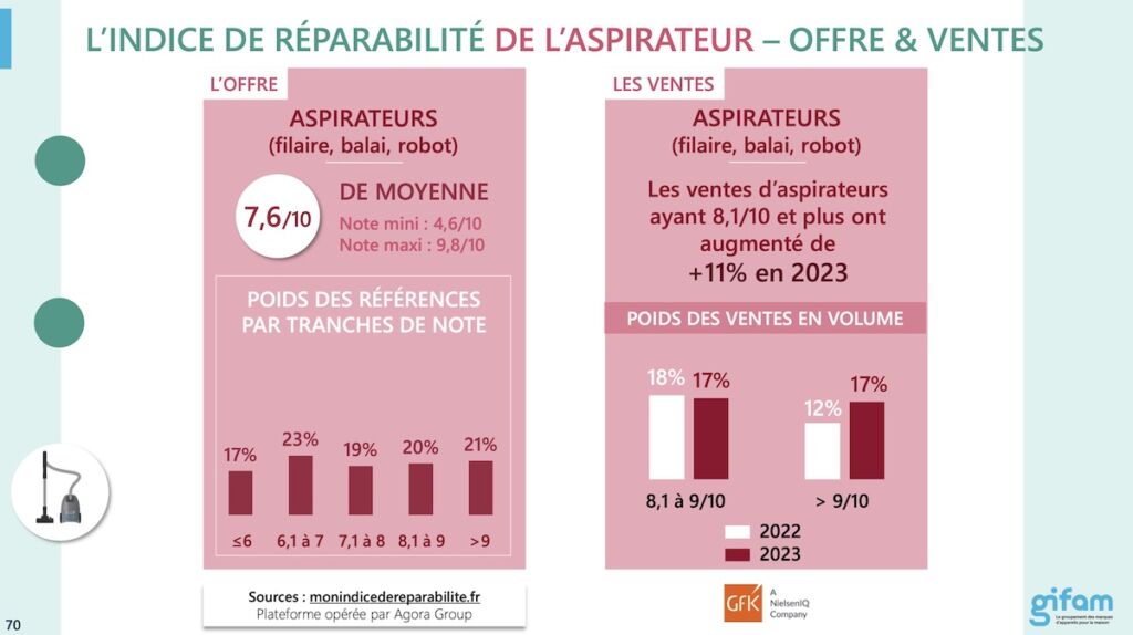 Toutefois, les consommateurs ne perdent pas de vue l’aspect durable et utilisent les outils qui sont à leur disposition pour choisir leurs équipements. Le Gifam a compilé des données montrant que lorsqu’ils choisissent un aspirateur (robot, traîneau ou balai), les consommateurs Français privilégient les modèles affichant le meilleur indice de réparabilité.
