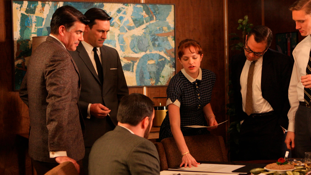 Le travail prend trop de place dans la vie des personnages, comme dans la nôtre, au point qu’il s’y passe des événements tragi-comiques. Un afterwork arrosé finit en drame quand une employée roule sur le pied d’un collègue avec une tondeuse à gazon. Un créatif obsédé par l’arrivée des ordinateurs dans la boîte se coupe un téton et l’offre à Peggy. Un cadre perd un œil lors d’une partie de chasse avec de gros clients. Un partenaire coupable de détournements de fonds se pend dans son bureau.