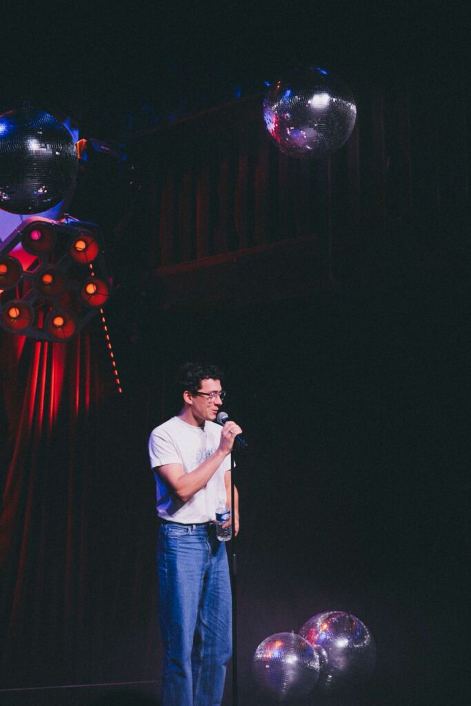 Comme j’estime être le premier spectateur de mon spectacle, j’ai fait quelque chose qui me correspond. C’est donc naturellement épuré. Tout doit disparaître, de Hannah Einbinder, m’a beaucoup marqué. Elle est habillée en noir, il n’y a rien sur scène, mais elle utilise un peu la lumière et les rideaux pour faire des blagues. Ça reste très sobre et je trouve ça marrant. Et puis, cette sobriété permet aussi de mettre l’accent sur le texte, le rythme, les punchlines. Comme ça, les gens se concentrent vraiment dessus. C’est ce qui me plaît : ça fuse tout au long du spectacle.