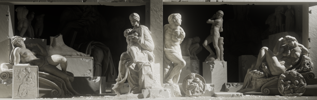 Mais, pour raconter la Renaissance, Jean-Baptiste Hardoin ne pouvait pas faire abstraction de la sculpture, notamment celles de Michel-Ange et son célèbre David. Pour l’inclure dans son programme, il a fait appel à des jumeaux numériques : « Nous avons pu intégrer au programme la bibliothèque laurentienne de Michel-Ange, car, pour les sculptures et les éléments architecturaux, nous avons eu la chance d’avoir accès à un corpus de scans de haute définition. Ils nous ont permis de travailler sur des modèles 3D des œuvres, sur lesquels nous avons pu créer des mouvements et des éclairages. Ainsi, nous les montrons sous des angles inhabituels, auxquels ont généralement seulement accès les conservateurs ou historiens de l’art. »