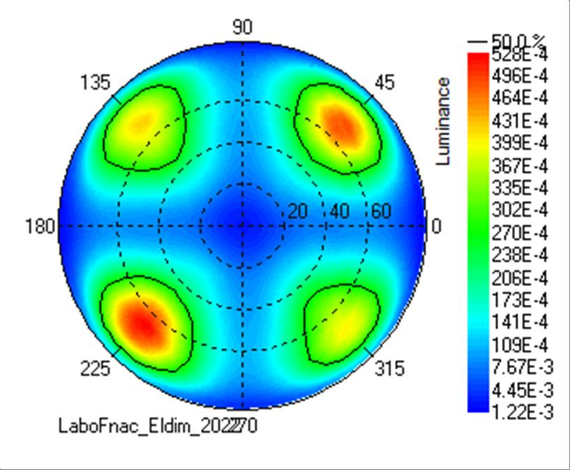 Le test de directivité permet d’évaluer une éventuelle dérive des couleurs qui dépend elle aussi du point d’observation. Pour ce faire, la luminosité est réglée au maximum afin d’effectuer les mesures sur plusieurs points avec des positions différentes. Là encore, il s’agit d’évaluer les performances dans les angles, et plus particulièrement le niveau des noirs et du contraste.