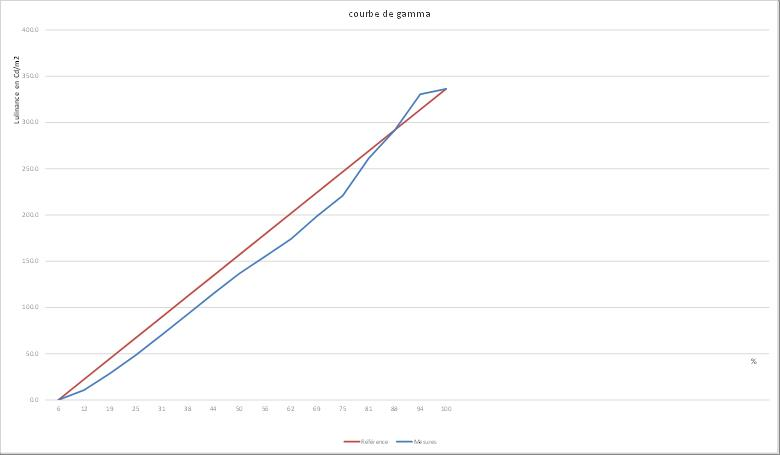 La progressivité du téléviseur est évaluée en comparant la courbe de gamma du signal vidéo en sortie, à celle du signal de référence en entrée. Globalement linéaire, la courbe de gamma du Samsung QE65QN90B montre que ce dernier retranscrit correctement le signal vidéo d’origine.