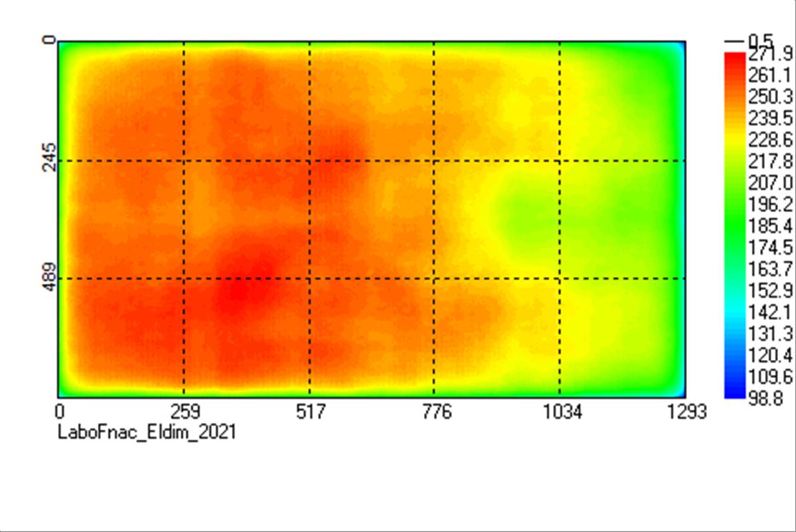 Les grandes diagonales d’écran peinent souvent à afficher une qualité d’image homogène sur toute la surface de la dalle. Ce n’est pas le cas du Samsung QE65QN90B qui offre une belle homogénéité tant dans la luminosité que dans les couleurs. L’écart d’uniformité de luminance de 23% est négligeable. Le Samsung QE65QN90B affiche une luminosité maximale de 255 cd/m² légèrement à droite et au-dessus du centre de la dalle de 65 pouces. À l’inverse, le minimum de 197 cd/m² est atteint dans le coin supérieur droit.