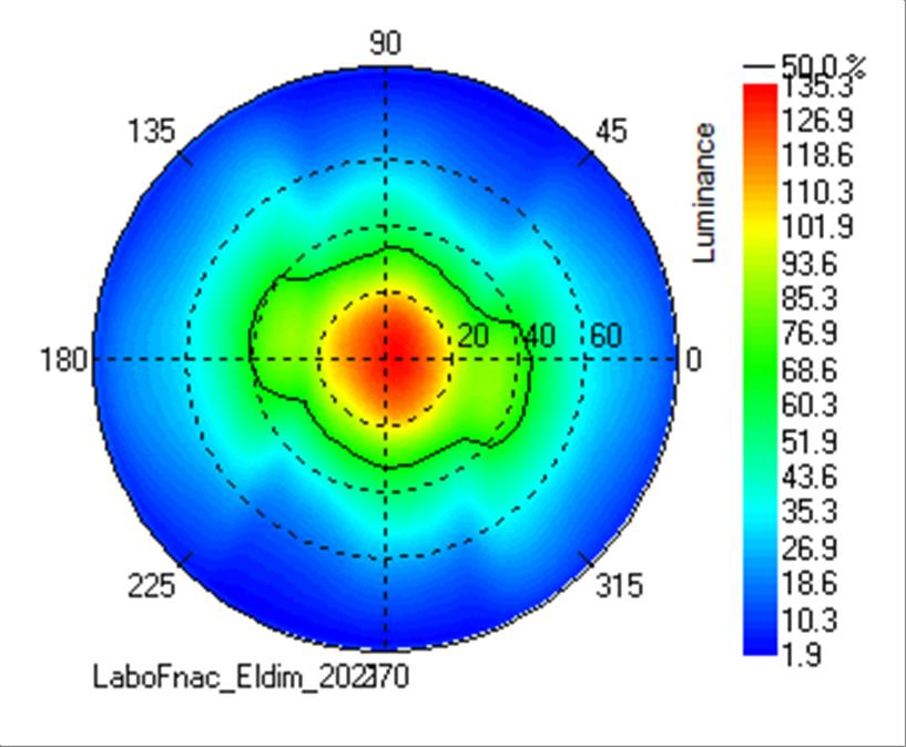 La technologie mini-LED affiche sensiblement le même niveau de noir dans l’axe ou dans les angles : 0,003 cd/m2 dans l’axe et 0,004 cd/m2 dans les angles. Une belle homogénéité pour ne pas être gêné par la directivité des LED.