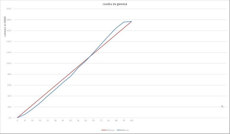 La progressivité du téléviseur est évaluée en comparant la courbe de gamma du signal vidéo en sortie à celle du signal de référence en entrée. La courbe de gamma du Samsung QE55QN95AAT est linéaire et similaire à celle du signal vidéo d’origine.