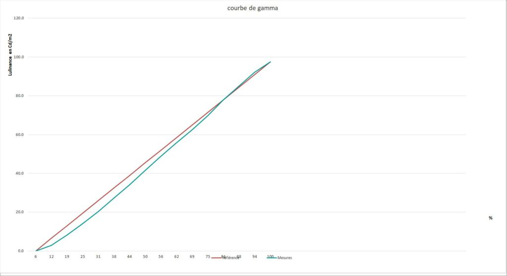 Pour évaluer la progressivité des téléviseurs, et donc leur fidélité, le Labo Fnac compare la courbe de gamma du signal vidéo de la source en entrée à celle du signal en sortie. Celles-ci doivent être aussi linéaires que possible et on retrouve ici une courbe similaire à celle de l’excellent LG OLED65G55LW. Le LG OLED65C54LA est donc capable de restituer un signal vidéo sans le dégrader pour reproduire précisément les différents dégradés et autres niveaux de gris.