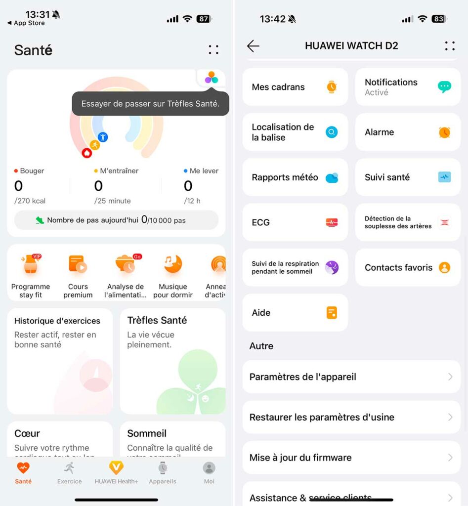 L’autonomie est un des points forts de la Watch D2. En utilisation standard (notifications, suivi du sommeil, quelques entraînements par semaine), elle peut tenir environ 7 jours. Une sollicitation plus fréquente des mesures de tension ou d’ECG ramène cette endurance à 4 ou 5 jours, ce qui reste très correct. On apprécie aussi beaucoup la charge rapide, qui permet de récupérer environ une journée d’autonomie avec dix minutes de charge seulement.