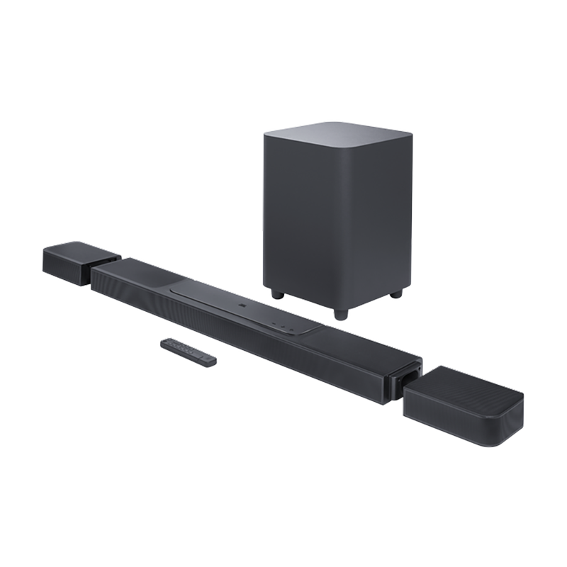 JBL sort l’artillerie lourde avec la Bar 1300. Son nom ne l’indique pas, mais la barre de son s’accompagne de deux satellites ainsi que d’un gros caisson de basses qui œuvrent de concert pour propulser votre installation dans une nouvelle dimension. C’est vrai : la puissance du combo est très importante. D’après les tests du Labo, elle excède les 103 dB. C’est très généreux, et devrait vous permettre de sonoriser sans mal un très grand salon. Peu sensible aux vibrations, la barre de son n’est pas parasitée par de la distorsion. Néanmoins, on constate que la signature sonore est un peu hésitante. Elle manque en tout cas d’homogénéité, comme en témoigne la courbe de réponse en fréquences disponible ci-dessous. Les basses sont un peu trop généreuses, et écrasent le reste du spectre – en particulier les aigus. À ce prix, il y a de quoi grincer des dents.