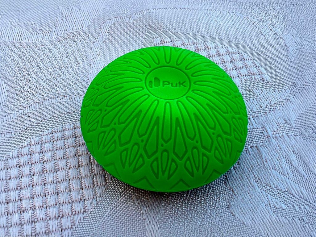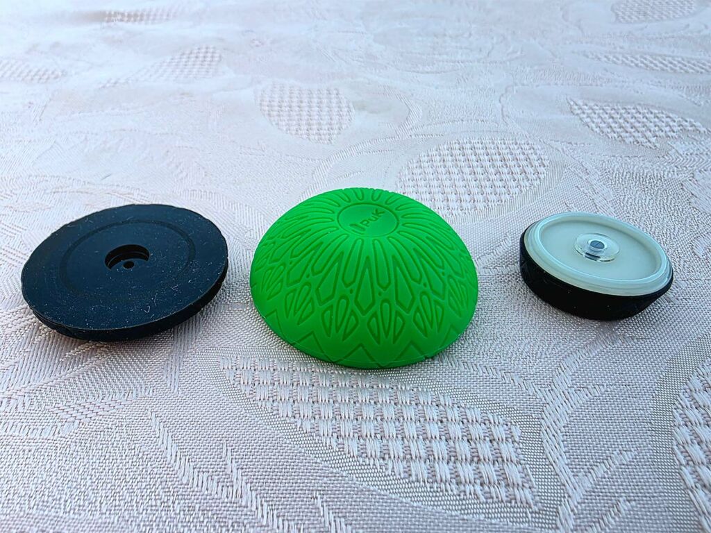 Le PuK Thumbstick se présente sous la forme d’un petit kit de trois pièces, pensé avant tout pour la portabilité. On y trouve le stick en lui-même, un large palet qui sert d’aimant à placer au dos du téléphone, et un couvercle en plastique d’un vert presque fluorescent. Une couleur si vive qu’elle semble conçue spécifiquement pour qu’on ne puisse jamais le perdre au fond d’un sac. L’ensemble, une fois assemblé, forme un petit galet compact et très facile à transporter, même dans une poche.