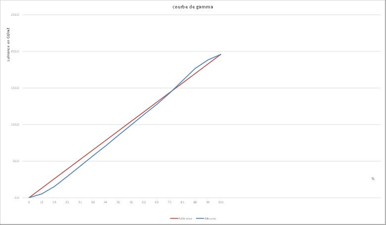 La progressivité du téléviseur est évaluée en comparant la courbe de gamma du signal vidéo en sortie à celle du signal de référence en entrée. La courbe de gamma du Samsung UE65TU6925K affiche une excellente linéarité. Comme on peut le voir sur le graphique ci-joint, sa courbe de gamma est pratiquement parallèle à celle du signal vidéo d’origine.