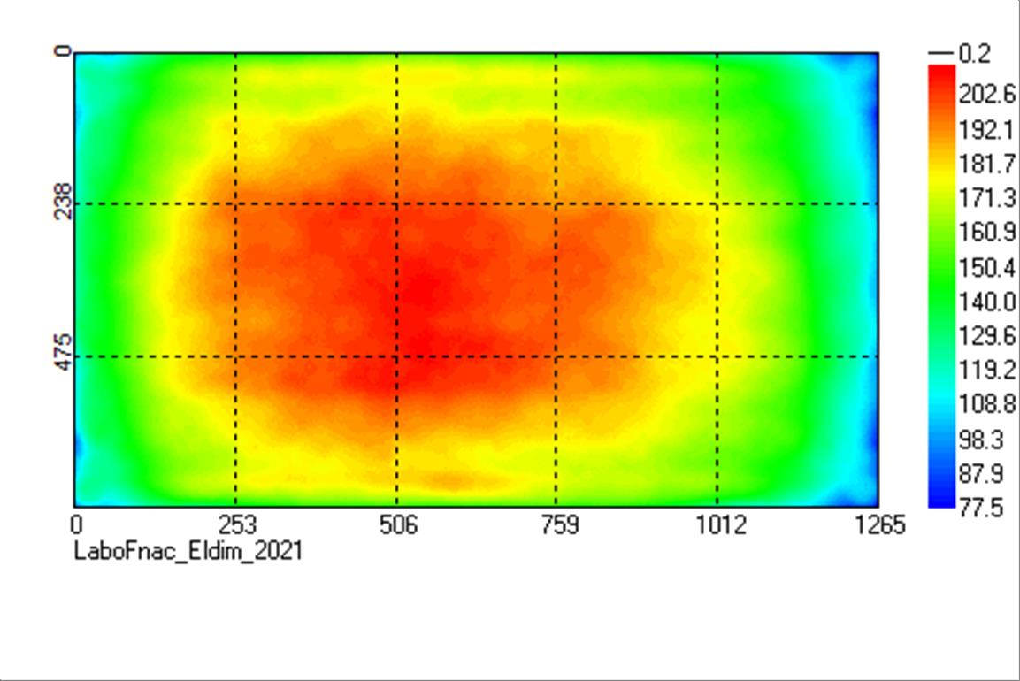 Les dalles de grande taille sont souvent mises à mal lors des épreuves de notre test d’uniformité. Pour autant le Samsung UE65TU6925K ne s’en sort pas trop mal. Certes, l’écart d’uniformité de luminance est trop élevé, avec 42 % de différence entre le point le plus clair et le moins clair de la dalle de 65 pouces. Nous avons divisé cette dernière en 35 zones de taille identique, et nous avons relevé une luminosité maximale de 205 cd/m2 juste en dessous à droite du centre de la dalle, et un minimum de 119 cd/m2 dans le coin supérieurs droit.