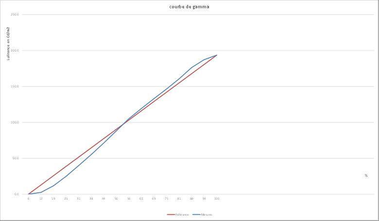 La progressivité du téléviseur est évaluée en comparant la courbe de gamma du signal vidéo en sortie à celle du signal de référence en entrée. La courbe de gamma du Samsung UE58AU7105K est globalement linéaire et pratiquement parallèle à celle du signal vidéo d’origine, comme on peut le voir ci-dessus.
