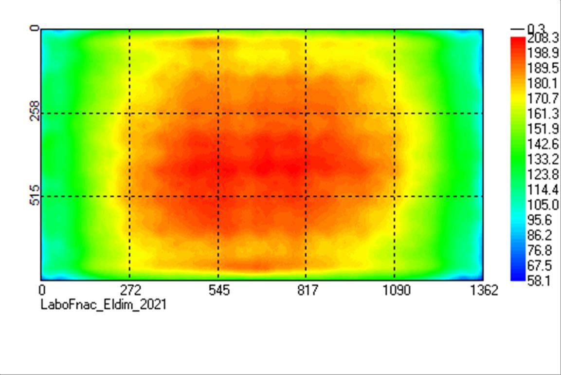 Le Samsung UE58AU7105K peine à afficher une luminosité uniforme sur toute la dalle de 58 pouces. Nous avons mesuré un écart important de 42% entre le point le moins lumineux et le point le plus lumineux. La luminosité maximale de 205 cd/m2 est atteinte en plein milieu de l’écran, tandis que le minimum de 119 cd/m2 est atteint dans l’angle supérieur droit.