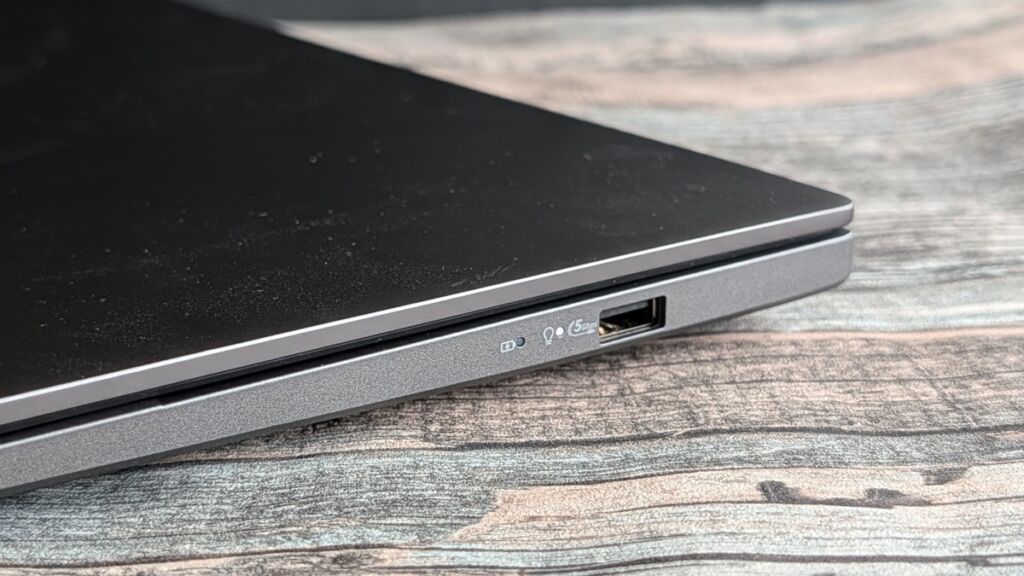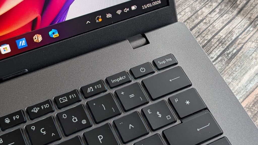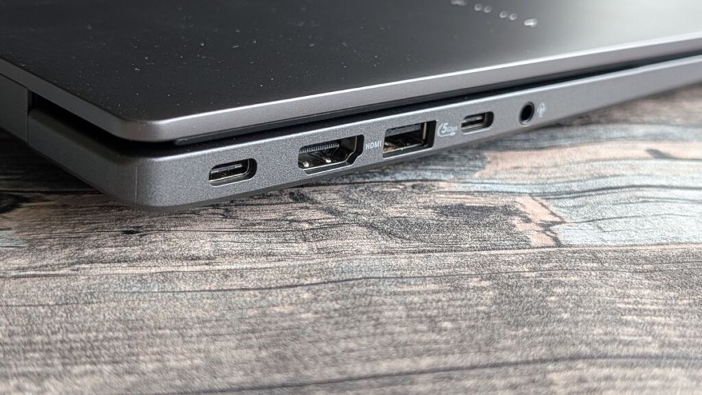 Les tranches offrent une connectique plutôt complète pour ce type de PC. Côté gauche, un port HDMI 2.1 côtoie deux ports USB-C 3.2 Gen 1 (dont l’un est mis à contribution pour la recharge), un port USB-A 3.2 Gen 1 et une prise entrée/sortie jack. Côté opposé, un autre port USB-A 3.2 Gen 1 clôt la panoplie. C’est assez complet pour y brancher l’essentiel sans avoir recours à un adaptateur ou un hub.