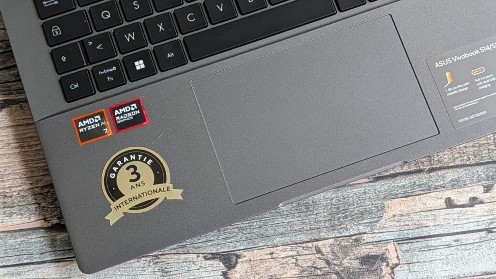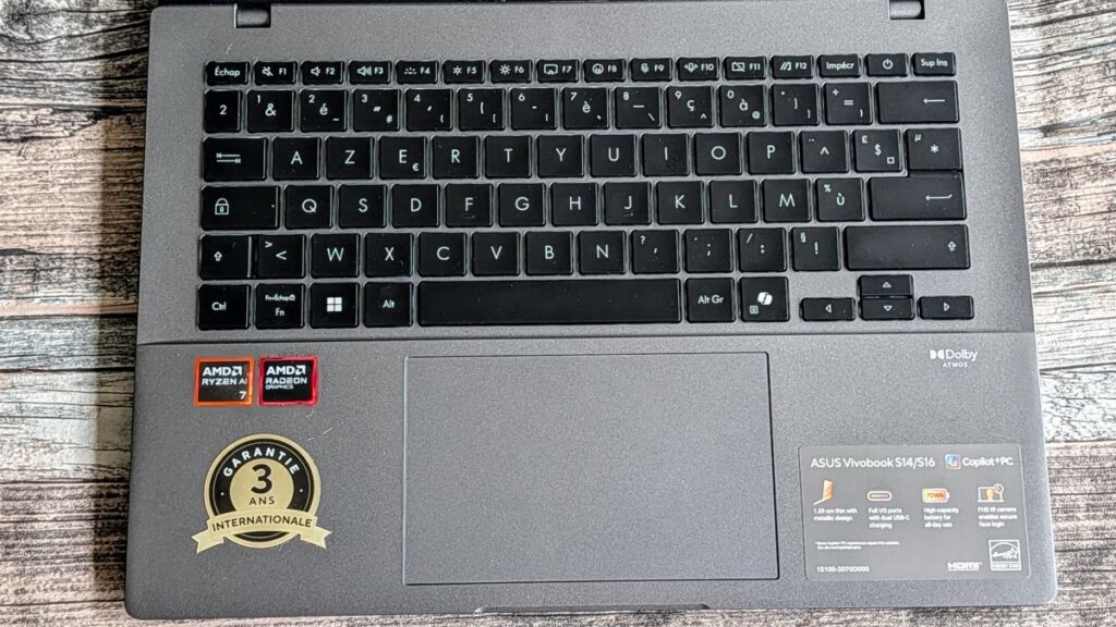 Ce n’est qu’une fois ouvert que l’on peut déplorer ce qui gâche un peu le tableau. Les traditionnels stickers – mentionnant ici l’intégration d’un processeur AMD et d’une puce graphique Radeon, là les vertus de l’appareil (batterie, connectique, Copilot+PC, etc.) ou, là encore, la garantie de trois ans – encombrent le repose-poignets. Une faute de goût qui reste pardonnable.